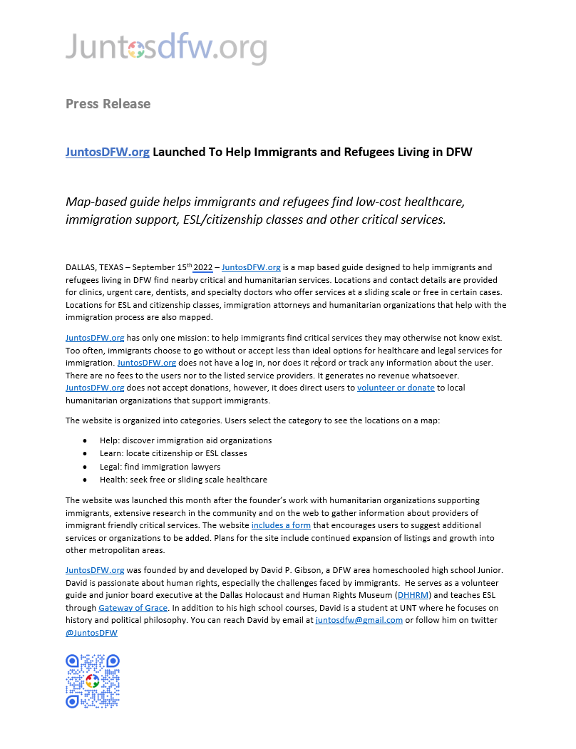 For media inquiries, contact juntosdfw@gmail.com or message on twitter @JuntosDFW. Use of any media, data, or file(s) downloaded from this site requires written consent from JuntosDFW.org